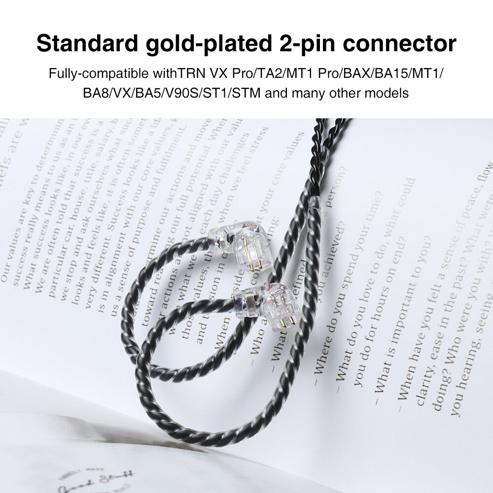 Parameters: Product Name: TRN A6 Colours:Black Connector types: 2-pin (S-type) Cable weight:13g Cable configuration: 4 cores woven with 14 strands each, every individual strand consists of 56 wires. Length:1.2m+3cm Jack types:Type-C Fit :Over-ears with soft ear loops ●Actual product specifications may vary, and all features, functinality and Parameters