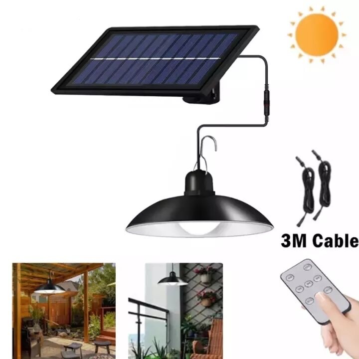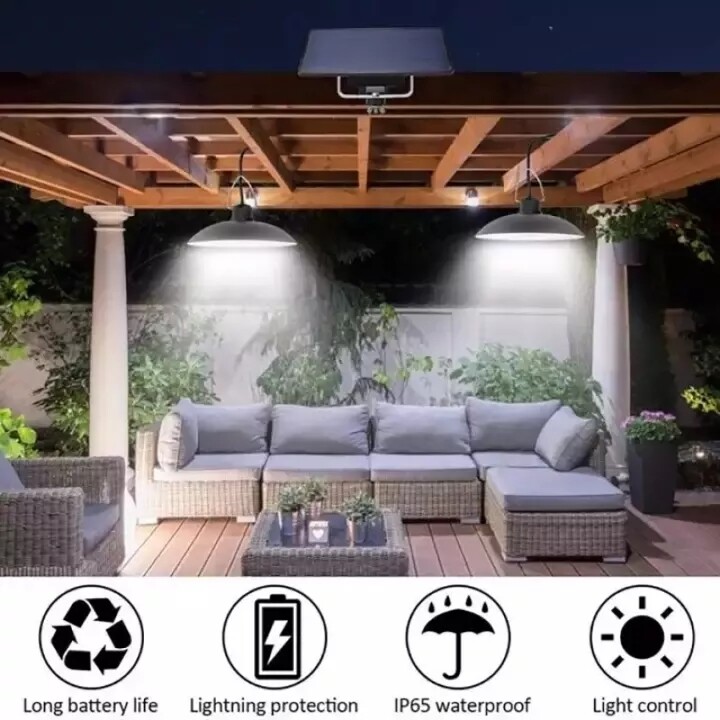 【Kkmaoyi】 Led Lampu Solar Pendant Light Outdoor Waterproof Garden Lights Double Headed Hanging Solar Panel Light Bulb Indoor House Ceiling Lamp with Remote Control 3M Cable for Yard Gate Camping Stree