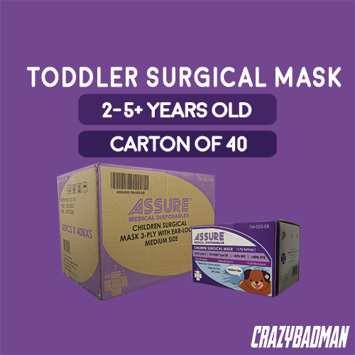 ASSURE Surgical Face Mask for Child, Children, Kids and TODDLER 3-Ply Earloop, Medium Size (12.5cm x 9.5cm), 50 Pcs/Box bundle