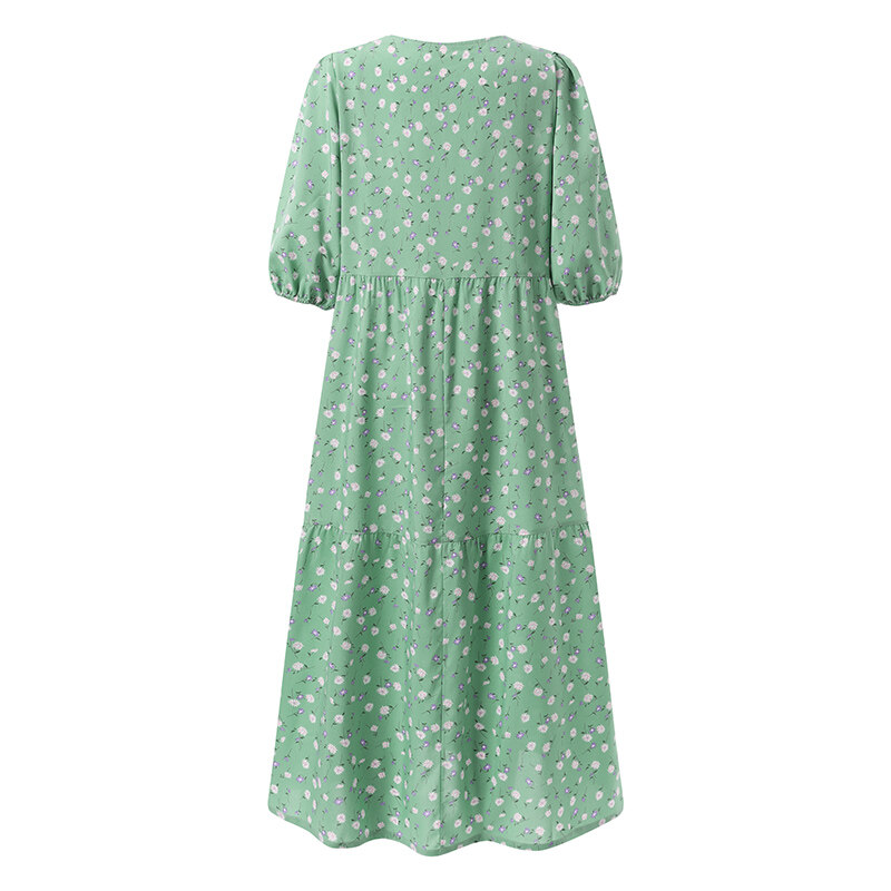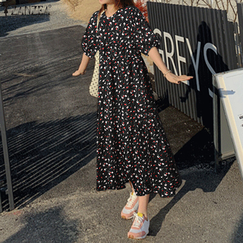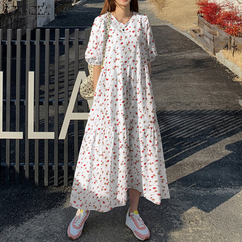 Rulfepy ZANZEA Women Korean Style Floral Print Tiered Layered Dress Short Sleeve Loose Long Maxi Sundress