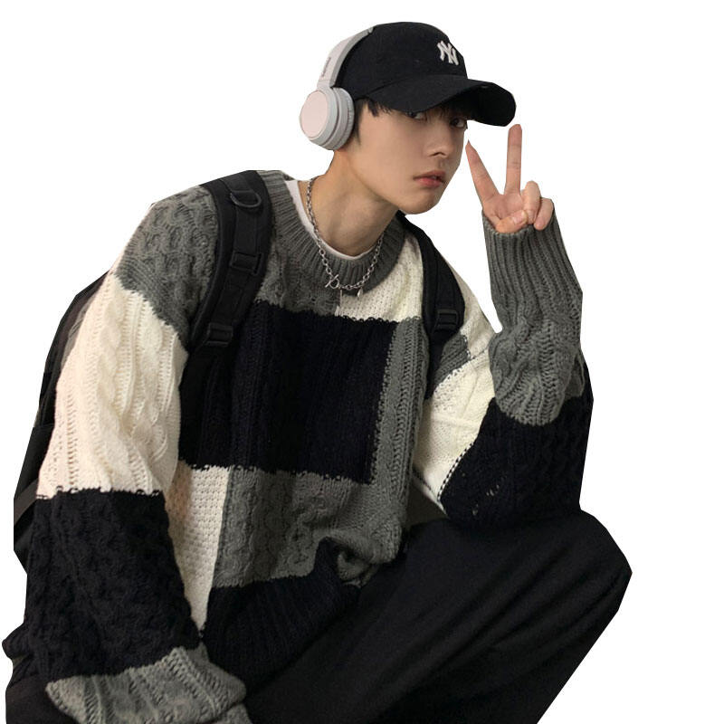 Contrasting Color round Neck Sweater Men's Autumn and Winter New Lazy Style Plaid All-Match Sweater Trendy Brand Bottoming Sweater