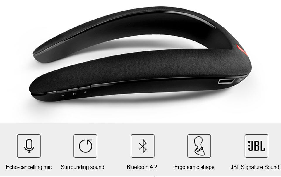 Introducing a totally new way of experiencing sound at home – by wearing it. Thanks to the JBSignature Sound wireless performance, the Soundgear creates your own personal sound zone while allowing you to remain fully aware of your surroundings. Bluetooth®-enabled for sound streaming from compatible devices, the JBSoundgear features Quad transducers with Bass boost for an exciting sound experience and 6 hours of playback time, a quick recharge time of 2 hours. Thanks to its dual mic conferencing system with echo-cancelling technology it provides crystal clear phone calls. The around-the-neck construction, ergonomic shape, intuitive controls, and soft touch fabric finish provide a hands-free and ears-free audio experience unlike any you’ve ever had before. Whether you want to give your VR experience a boost with immersive audio, watch a video, add music to your daily activities around the house or take a conference call, the JBSoundgear provides you with an exciting, pervasive sound experience with total freedom and comfort.