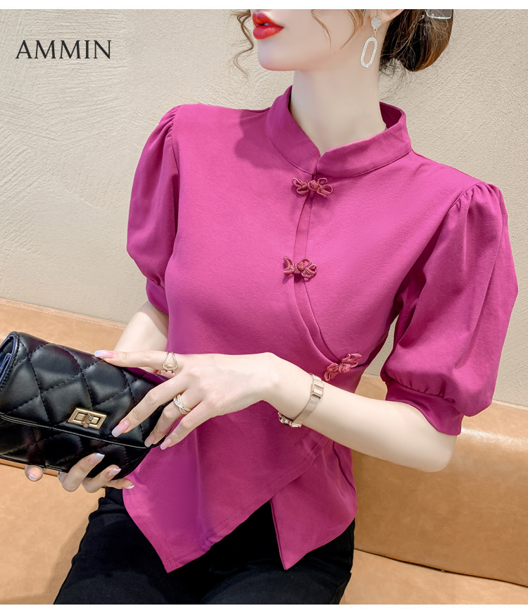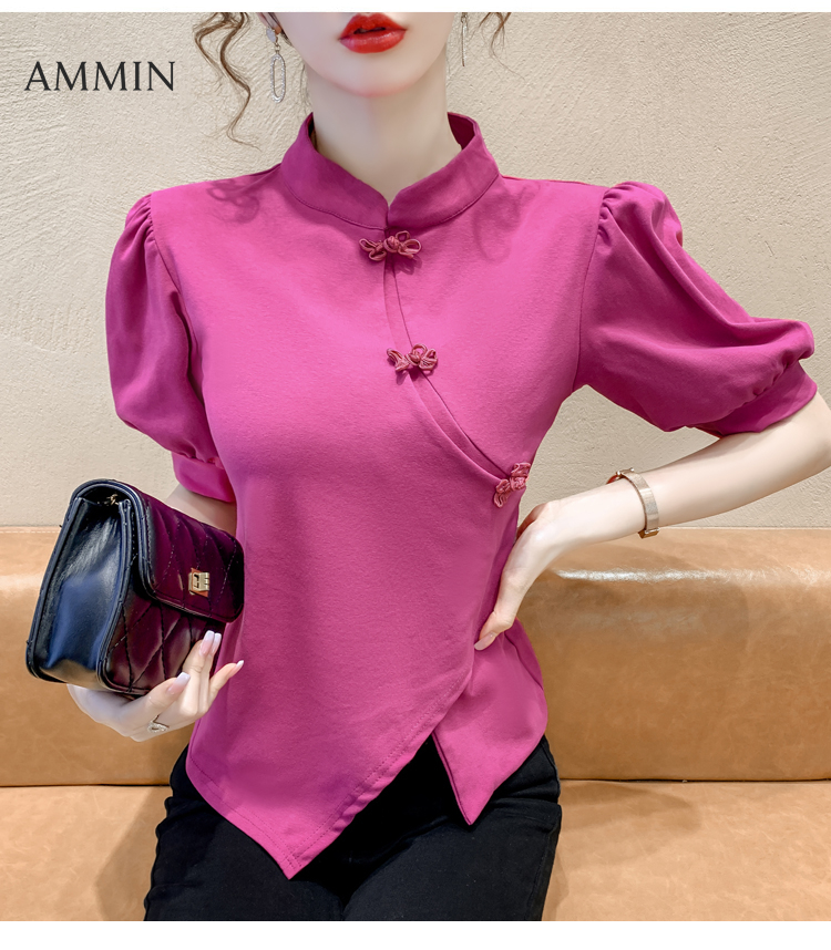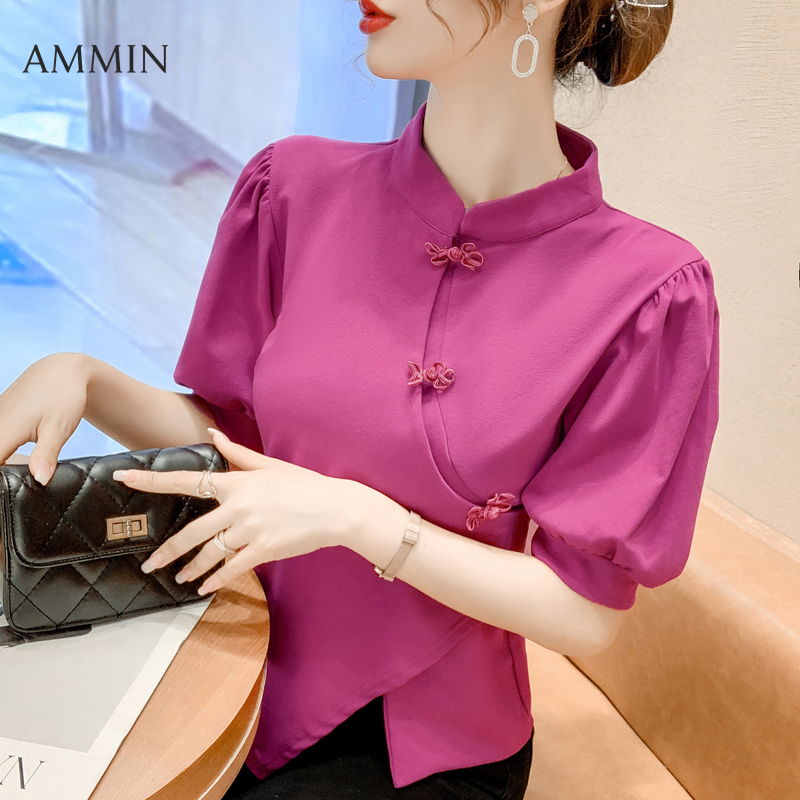 AMMIN 2022 summer new retro niche Chinese ethnic style disc button cheongsam elegant blouse women's stand-up collar bubble short-sleeved chiffon shirt female ins tops