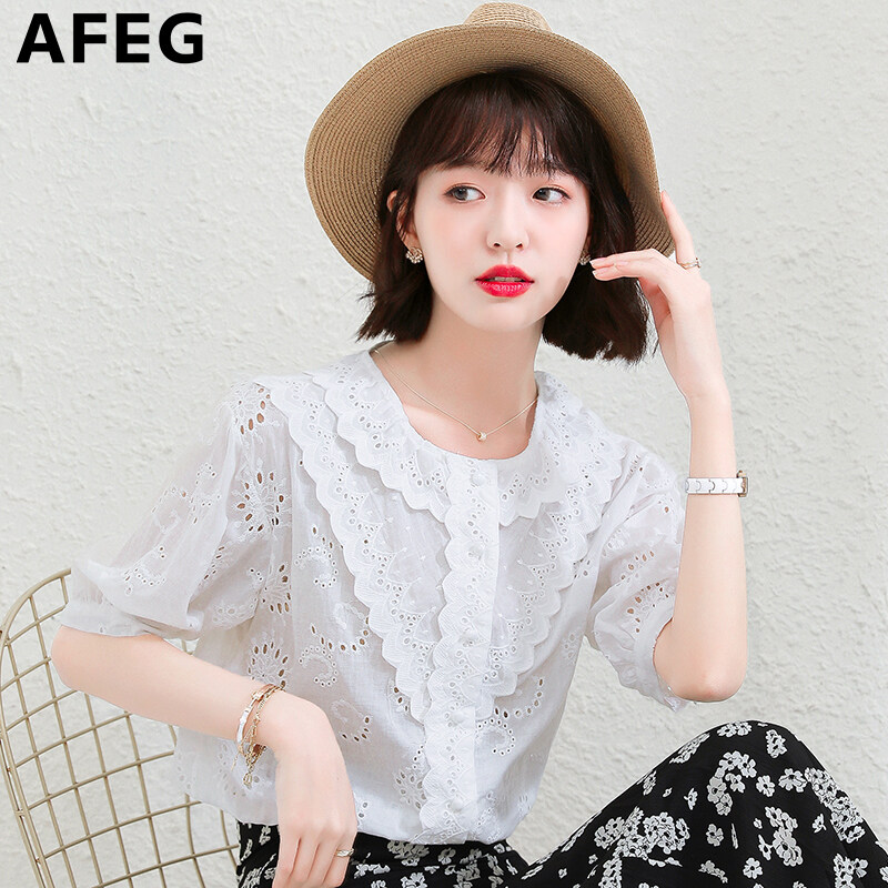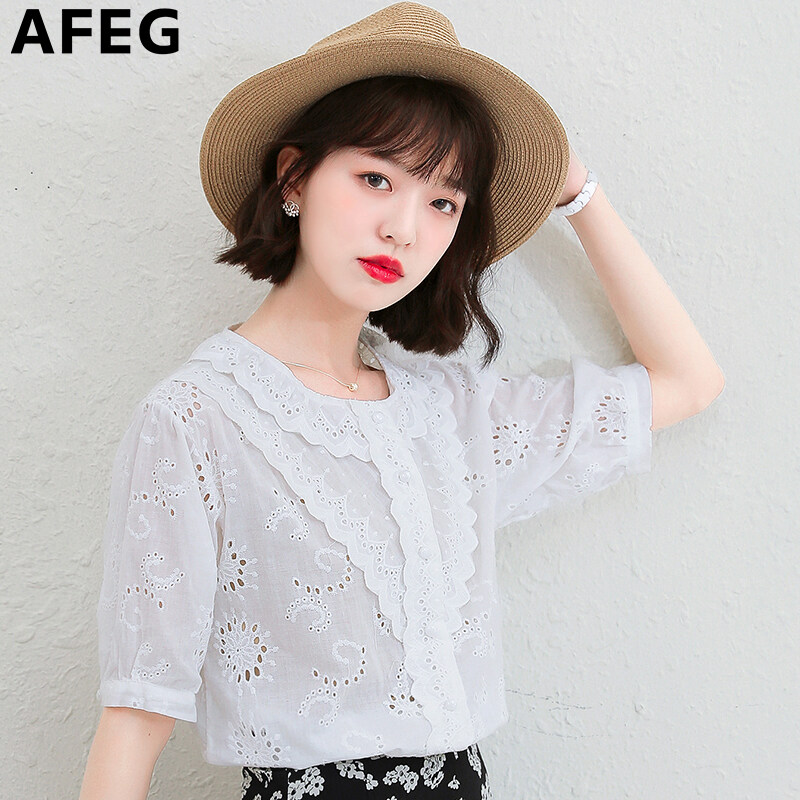 AFEG new Korean version round neck fashion loose all-match temperament embroidered cotton short-sleeved blouse for women