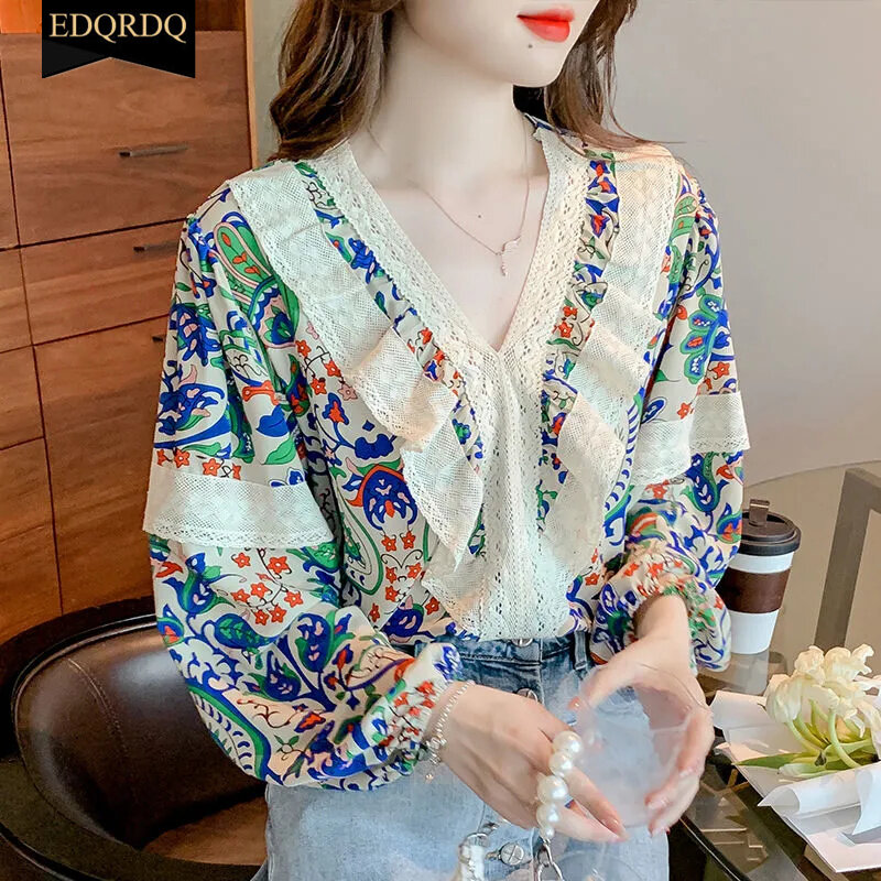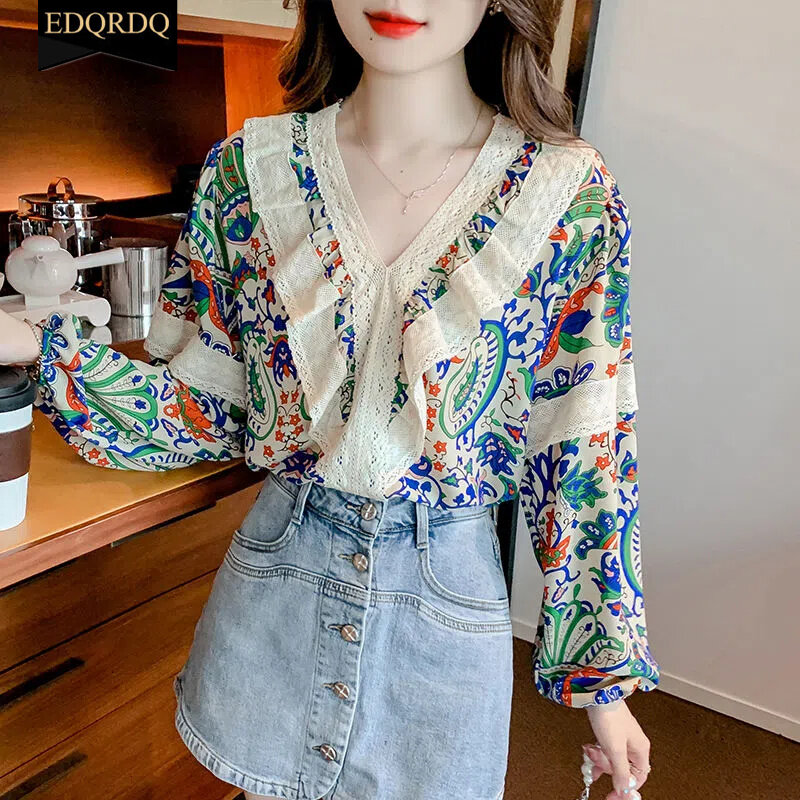 EDQRDQ French Floral Tops Puff Sleeve Lace Shirts Ethnic Blouses for Women