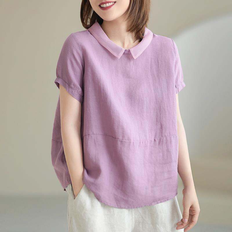 2021 Summer New Artistic Casual Korean Style Loose Casual Large Size Imitation Cotton and Linen Short Sleeve Stitching Lapel Shirt for Women