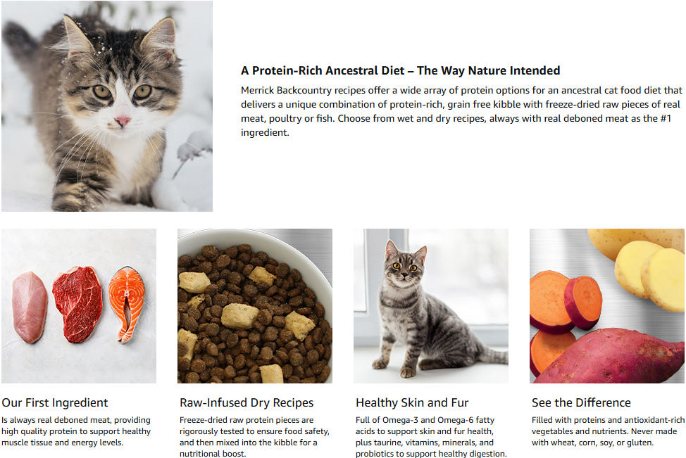 • Merrick Backcountry cat food recipes contain no corn, wheat, or gluten and are made without artificial colors, flavors, and preservatives. Proudly founded in Hereford, TX, crafted in USA facilities