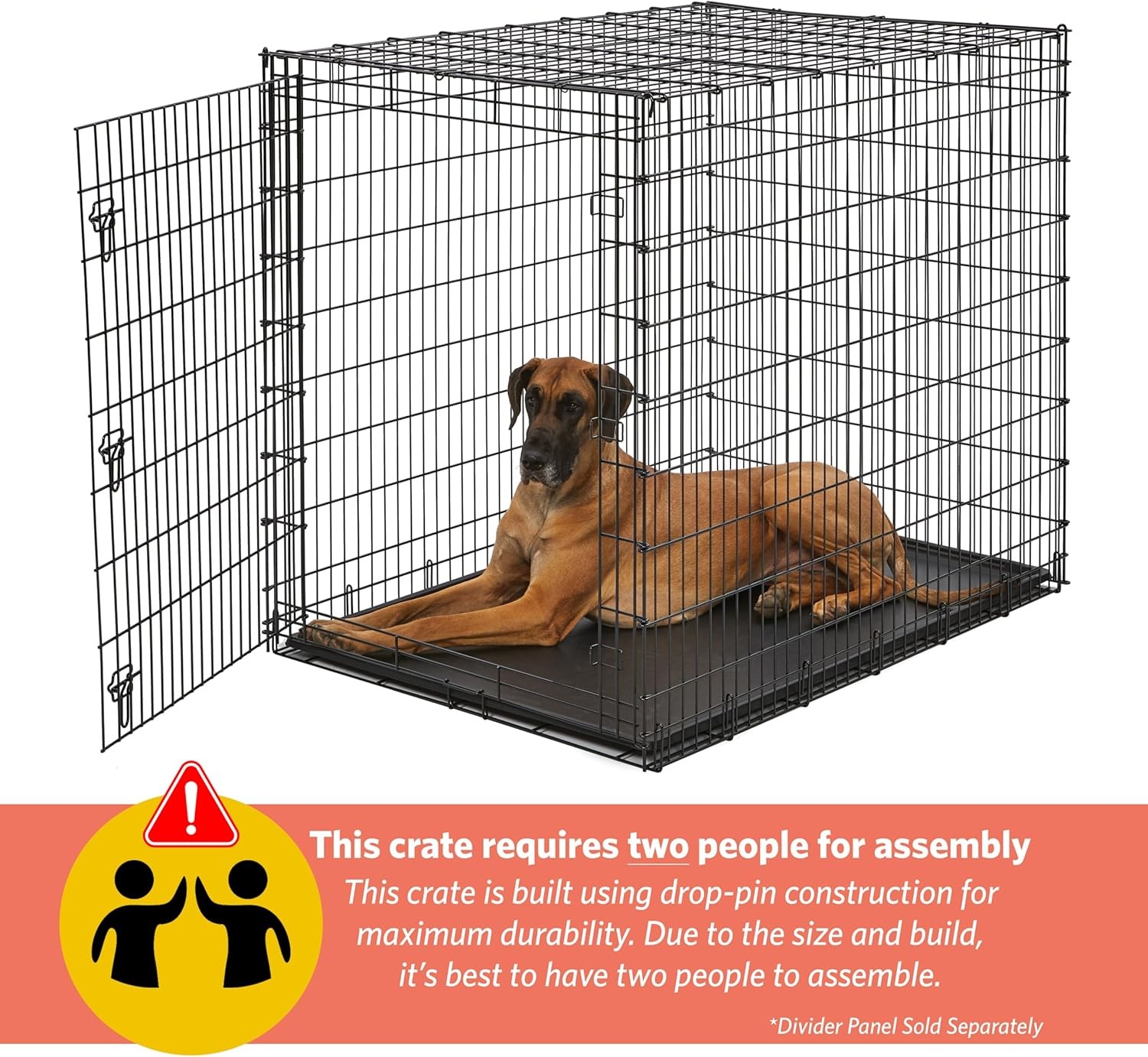 Unlike our smaller sized dog crates, the 54-inch crate utilizes drop pin construction for maximum durability; this requires two people for assembly, *divider panel sold separately