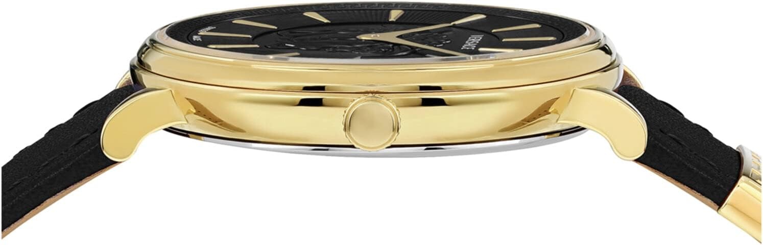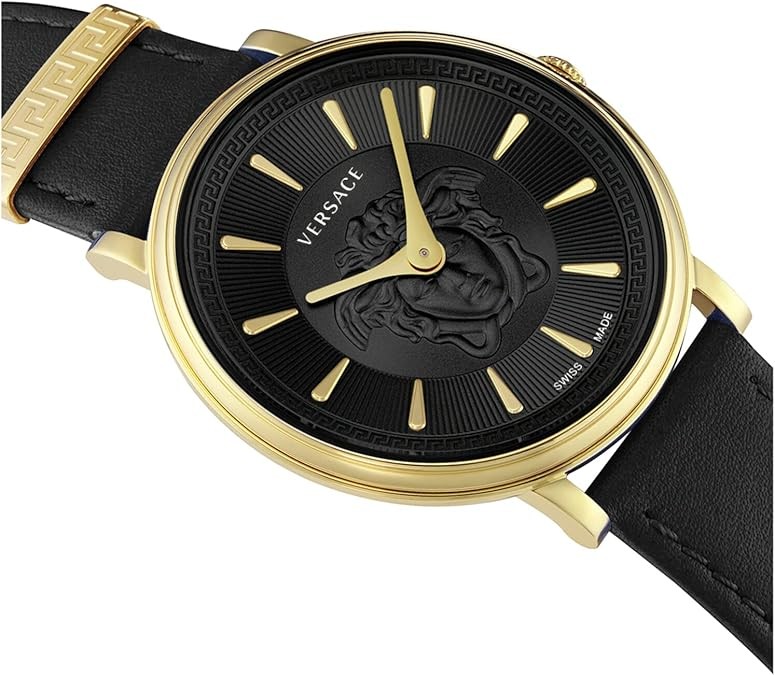 Versace Greca Collection Luxury Womens Watch Timepiece with a Black Strap Featuring a Gold Case and White Dial